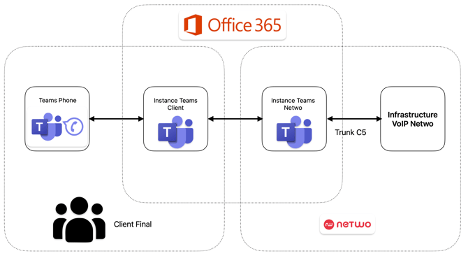 L'interconnexion entre l'instance Teams client et la plateforme OpenVNO s’effectue via un Trunk SIP C5. Ce dernier communique avec la plateforme Microsoft en TLS/SRTP.