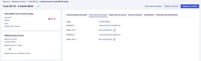 Les valeurs TXT sont à paramétrer dans Mon Parc > Solution Voix Fixe > Trunk Entreprise (C5) dans l'onglet "Configuration". Les deux valeurs TXT pour les deux domaines sont à configurer.