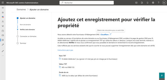 Une valeur TXT vous sera alors attribué par Microsoft au format MS=ms42424242, copier cette valeur. Dans l'interfaceNetwo remplir alors la valeur correspondant au domaine.
