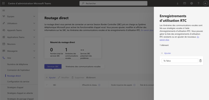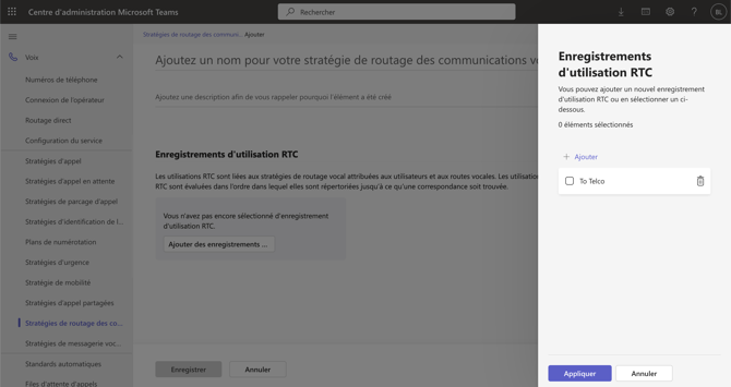 En haut à droit cliquer sur Gérer les enregistrements d'utilisation RTC puis cliquer sur Ajouter et remplir le champs avec la valeur "To Telco". Valider ensuite.