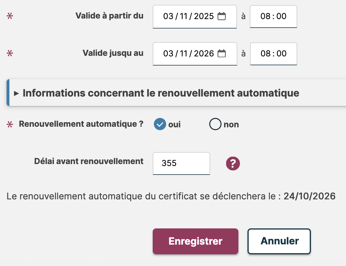 Nous vous recommandons de souscrire à 2 certificats, avec des dates de validité distinctes, afin de vous assurer de ne pas subir de coupure au moment du renouvellement.