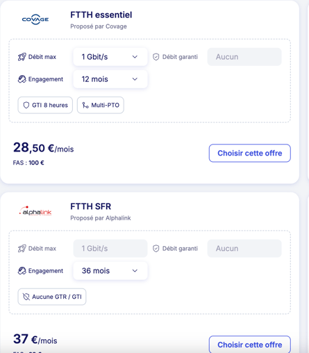 - Sélectionnez une offre FTTH chez un opérateur éligible à la création d'un 2ème PTO (voir ci-dessus) et cliquez sur commander