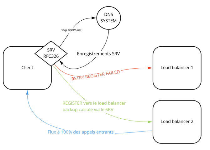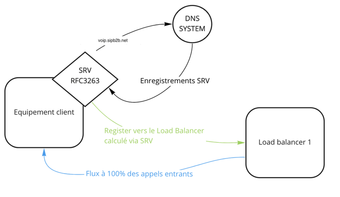 Pour les équipements supportant les enregistrements SRV (tels que définis dans la RFC3263) et capables de les utiliser pour répartir le trafic sortant entre les différents serveurs mis à disposition au titre du Contrat, l'utilisation de voip.sipb2b.net peut être privilégiée.