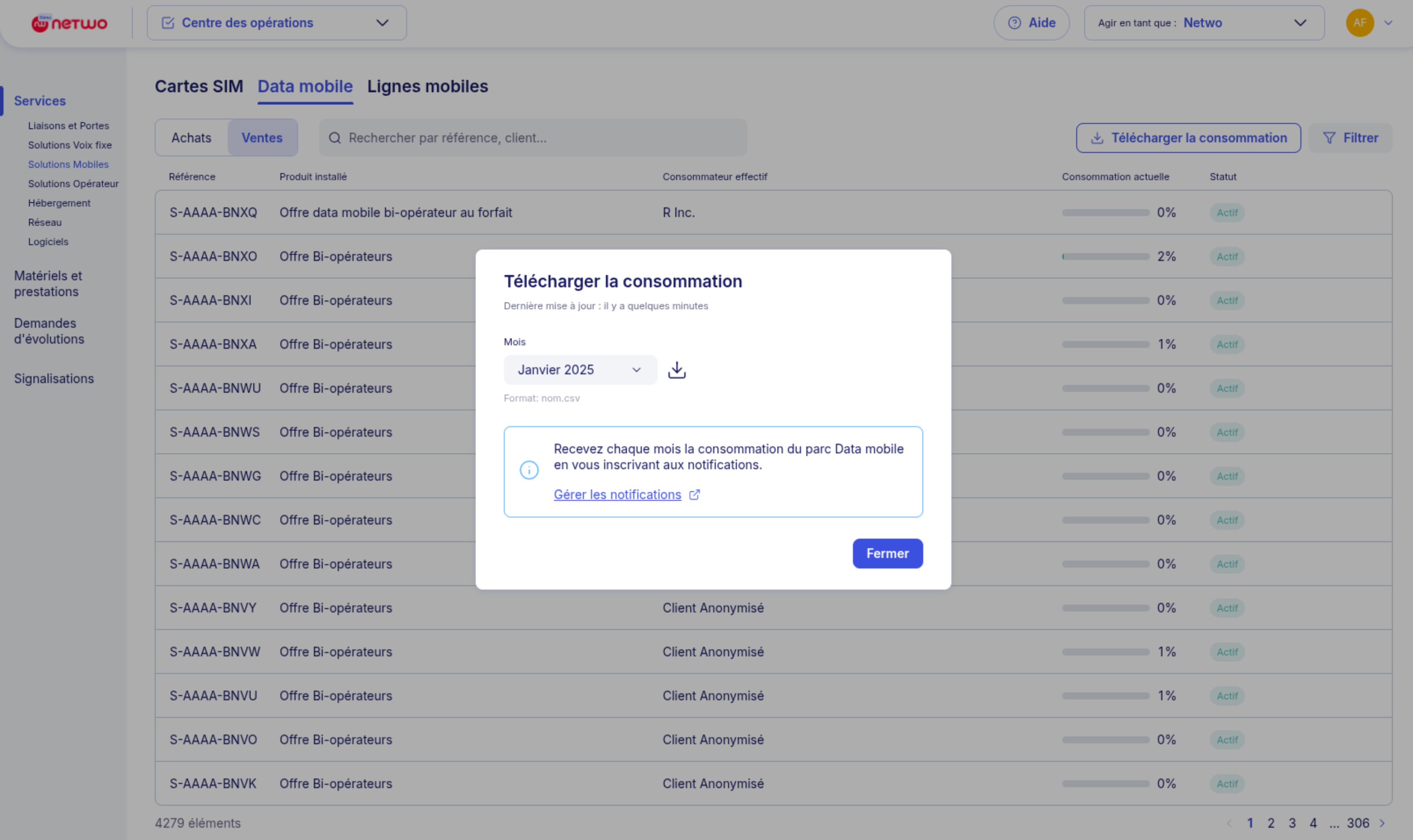 Téléchargez l’historique complet de vos consommations data mobile (jusqu’à 12 mois) au format CSV, directement depuis votre Centre des Opérations > Solutions Mobiles.